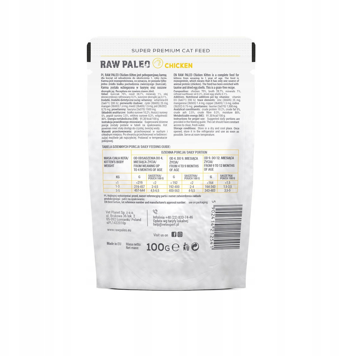 Η Υγρή Τροφή VetExpert Raw Paleo είναι ειδικά σχεδιασμένη για ανήλικες γάτες, προσφέροντας μια ισορροπημένη κανονική διατροφή που καλύπτει τις καθημερινές τους ανάγκες. Με βάση το κοτόπουλο, αυτή η τροφή παρέχει την απαραίτητη θρέψη για τη σωστή ανάπτυξή τους, χωρίς να προορίζεται για την αντιμετώπιση ασθενειών.