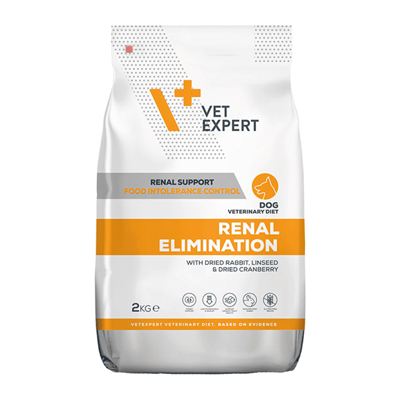 Η τροφή Vet Expert Renal Elimination δημιουργήθηκε για σκύλους που πάσχουν από νεφρική ανεπάρκεια σε συνδυασμό με τροφική δυσανεξία . Η σύσταση της τροφής είναι μονοπρωτεϊνική και χωρίς γλουτένη, που σημαίνει ότι η μόνη πηγή ζωικής πρωτεΐνης είναι το κουνέλι και η μόνη πηγή υδατανθράκων είναι το καστανό και το λευκό ρύζι.