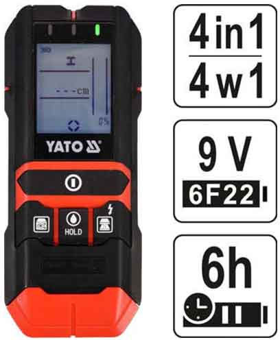 Η χρήση ανιχνευτή YATO YT-73138 και μέτρου 4 σε 1 επιταχύνει σημαντικά την εργασία, αυξάνει την ασφάλεια και ελαχιστοποιεί τον κίνδυνο τυχαίας βλάβης στην ηλεκτρική ή υδραυλική εγκατάσταση που βρίσκεται κάτω από το σοβά. Χάρη σε αυτό μπορείτε, μεταξύ άλλων, να ανοίξετε με ασφάλεια μια τρύπα ή να βρείτε ένα μέρος για να βιδώσετε μια βίδα σε ένα ξύλινο ή μεταλλικό προφίλ κρυμμένο κάτω από μια γυψοσανίδα. Ο ενσωματωμένος μετρητής υγρασίας θα επιτρέπει, μεταξύ άλλων, τον προσδιορισμό του επιπέδου υγρασίας του σοβά στις θερμογέφυρες, καθώς και τον έλεγχο της υγρασίας για ξύλο που προορίζεται για καύσιμο.